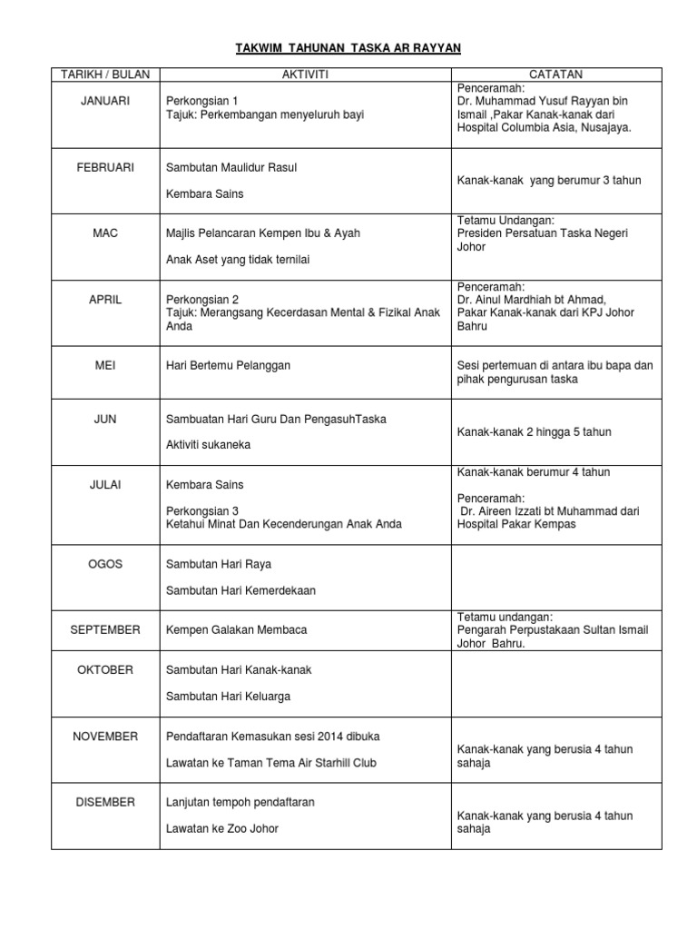 Takwim Tahunan Taska Ar Rayyan Pdf