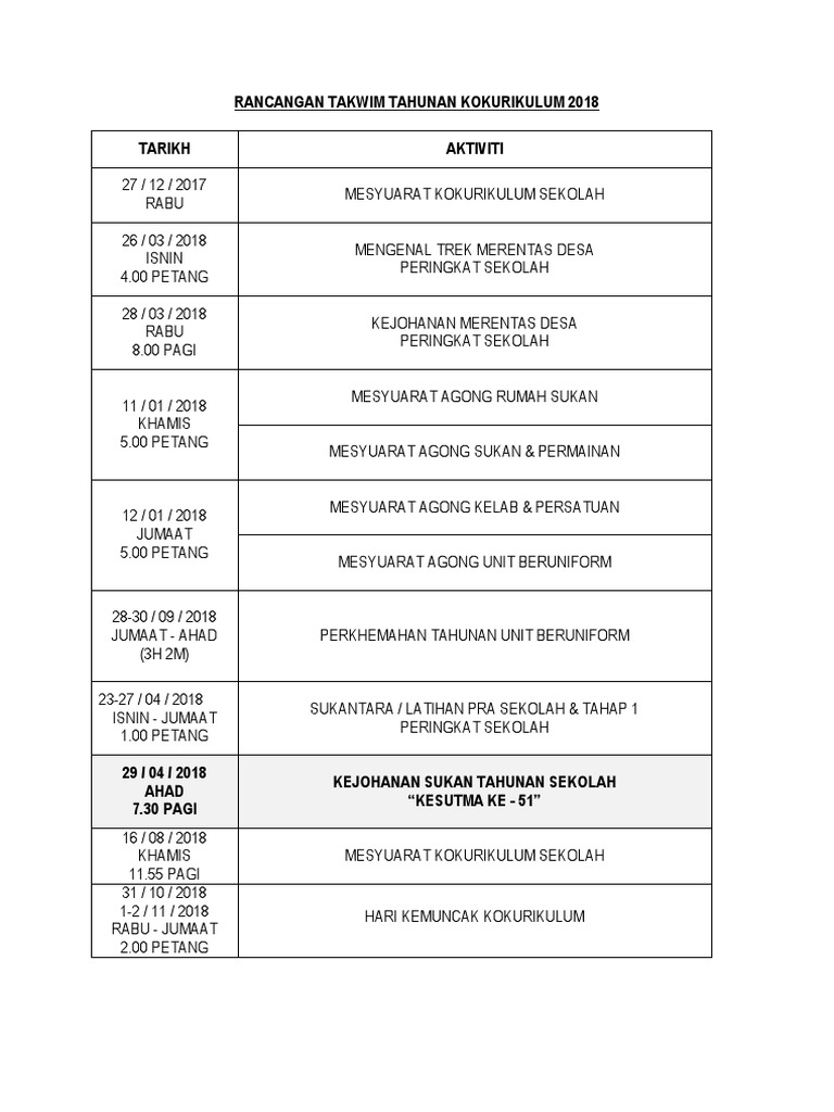 Contoh Rancangan Takwim Tahunan Kokurikulum 2018 Pdf