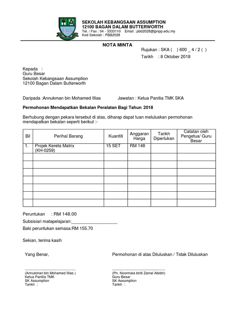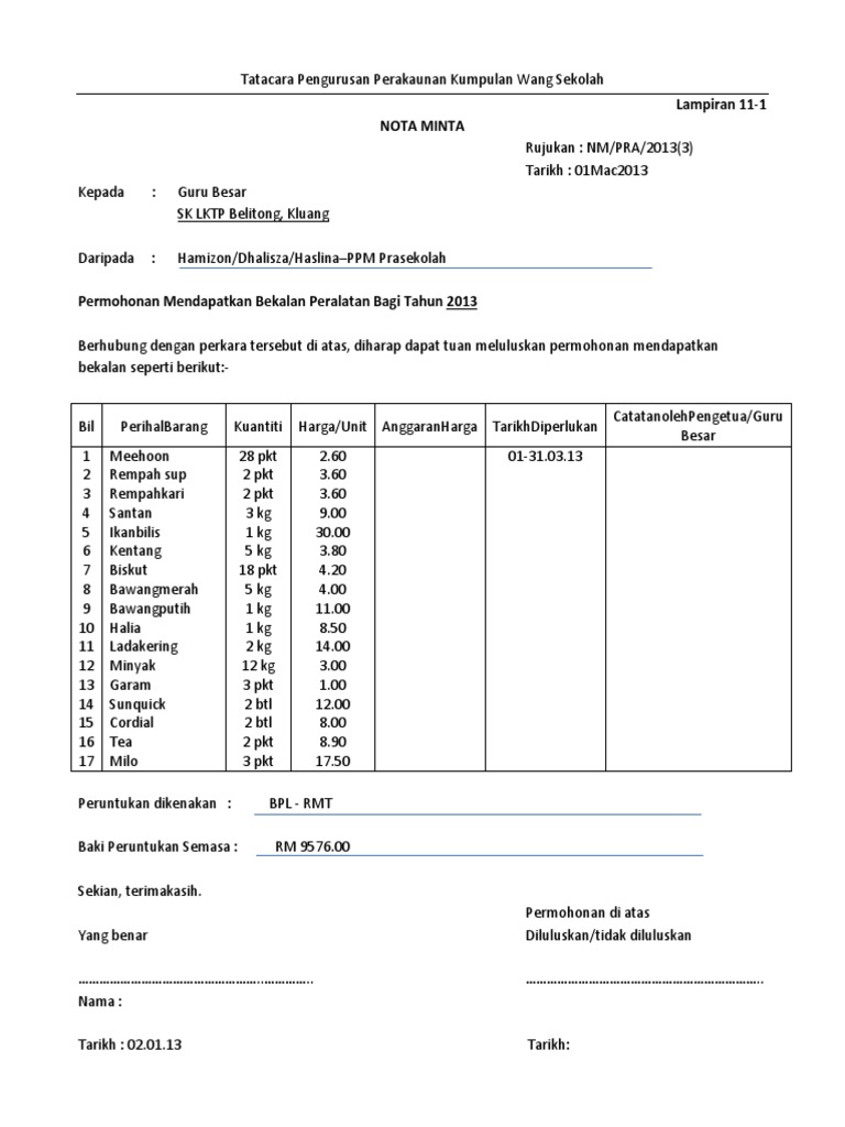 Templat Nota Minta. Cari di dalam dokumen. Yang asal iaitu bilinvois pesanan sekolah nota minta atau satu penyataan yang telah diperakui seperti kertas kerja terperinci.